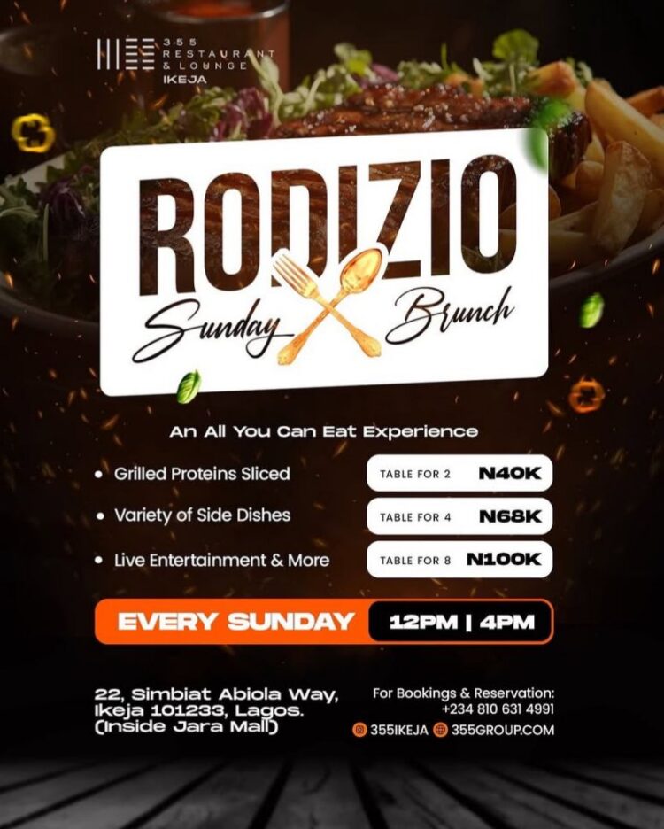 An all you can eat experience every Sunday at 355 Restaurant Ikeja from 12am – 4pm for 40k