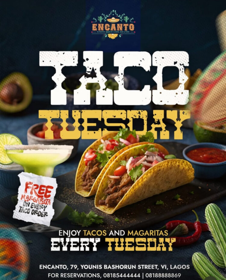 Get A Free Margarita Cocktail on all Taco Orders every Tuesday at Encanto Restaurant, 79 Younis Bashorun Street, VI, Lagos.