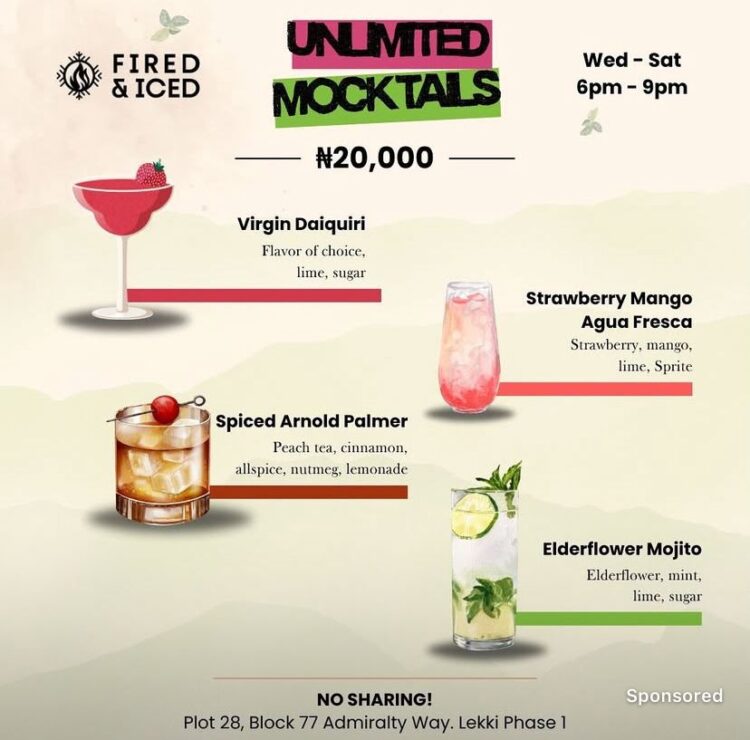Enjoy unlimited mocktails Every Wednesday – Saturday from 6pm – 9pm for 20k per person.