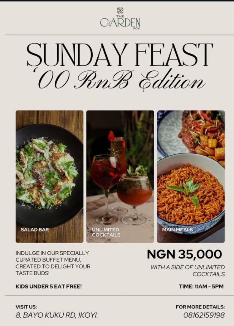 Every Sunday from 11am – 5pm enjoy unlimited cocktails, buffet style meals, kids under 5 eat for free at the Garden Restaurant in Ikoyi.